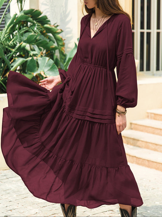 Tie Neck Long Sleeve Midi Tiered Dress