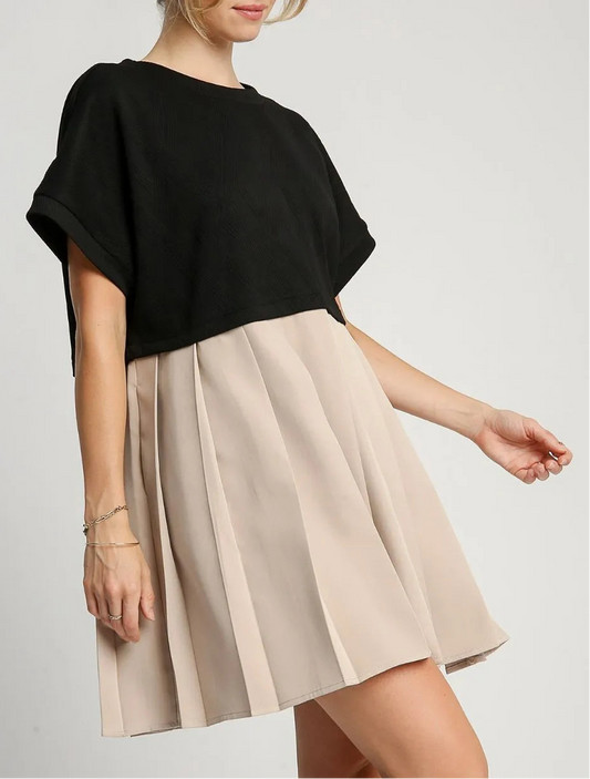 Two Tone Pleated Long Sleeve Shirt Dress