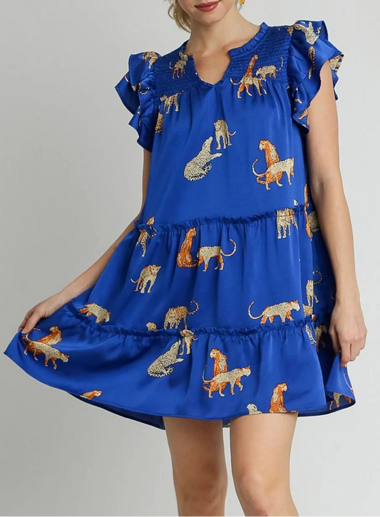 Cheetah Print Notched Ruffle Layered Cap Sleeve Mini Dress + Plus Size