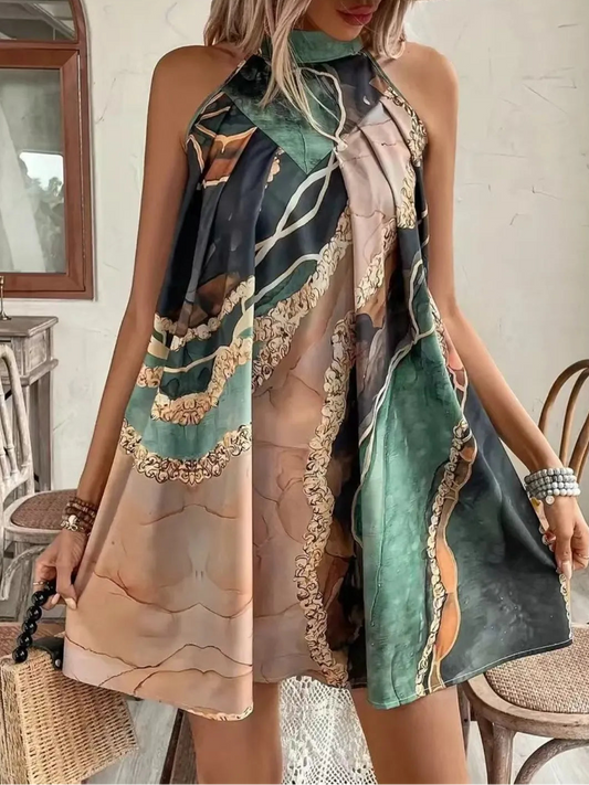 Tie-Dye Halter Ruched Mini Dress with Side Drawstring