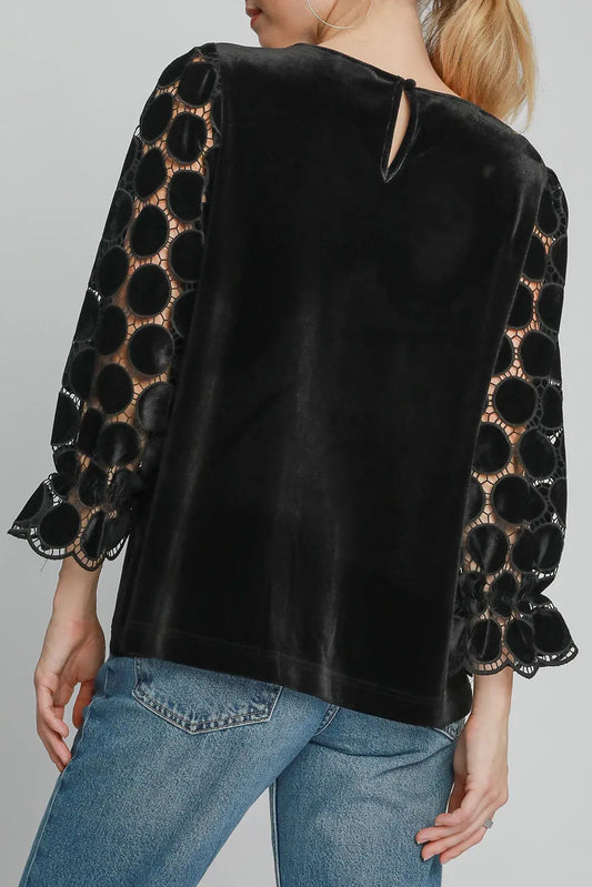 Polka Dot Lace Long Sleeve Round Neck Blouse
