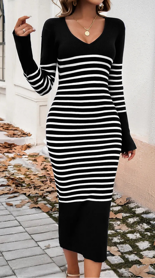 Striped V-Neck Long Sleeve Sweater Dress