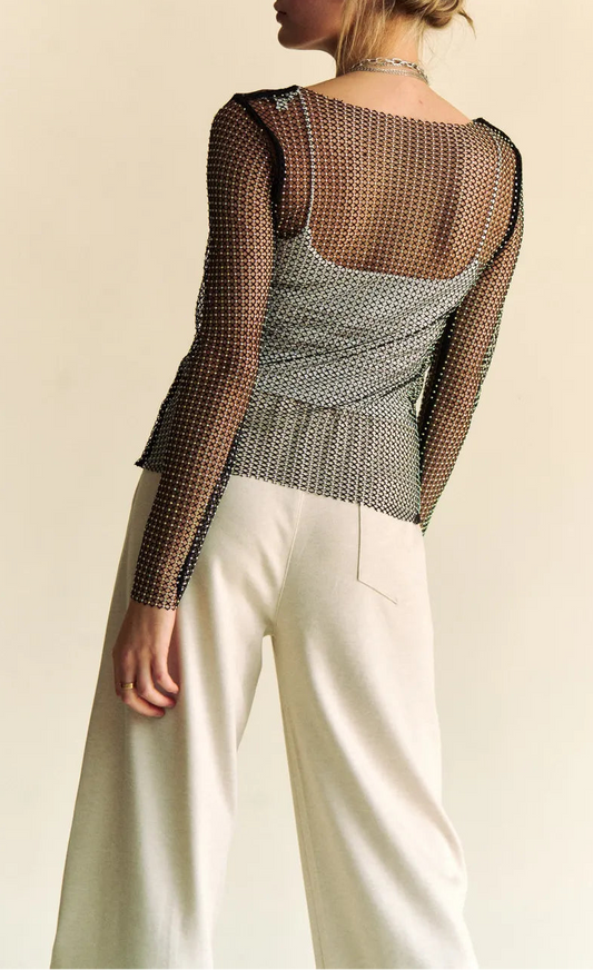 Rhinestone Sheer Mesh Round Neck Top