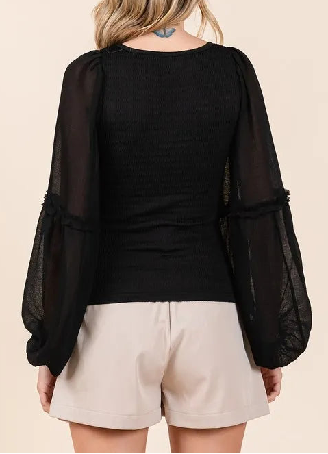 Mixed Media Textured Knit Chiffon Long Sleeve Top