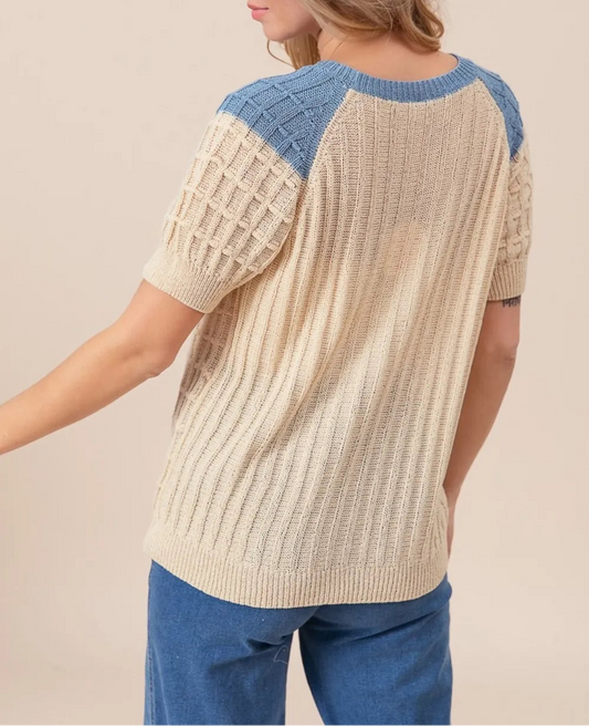 Textured Contrast Short Sleeve Sweater